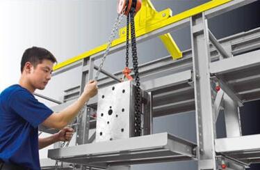 模具雖然體積不大,但是它特別重,單靠人力是不便于搬運(yùn)的,而工廠為了提高工作效率,每個(gè)模具架都配有一個(gè)手拉葫蘆,當(dāng)工廠需要使用到某個(gè)模具時(shí),工人通過(guò)手拉葫蘆就能快速的將模具吊運(yùn)出來(lái),既節(jié)省人力勞動(dòng),又提高工作效率。